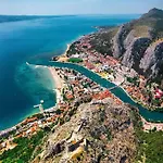 Apartman s pogledom na grad, more i rijeku Omis površine 85 m² smješten je na samoj plaži, udaljen 12 minuta hoda od crkve sv. Mihovila na trgu, te ima 2 spavaće sobe. Gosti su pozvani da koriste dostupno parkiralište u blizini.